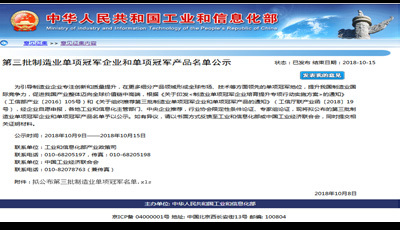 10 月8 日,工业和信息化部产业政策司公布了《关于第三批制造业单项冠军企业和单项冠军产品名单公示》,新疆AG手机官方网站入口-AG(中国)公司根据《关于印发< 制造业单项冠军企业培育提升专项行动实施方案> 的通知》(工信部产业〔2016〕105 号)和《关于组织推荐第三批制造业单项冠军企业和单项冠军产品的通知》(工信厅联产业函〔2018〕19 号)要求,组织材料申报了制造业单项冠军产品- 异亮氨酸,截至目前已顺利通过审核并公示,公示于10 月15 日结束。异亮氨酸单项冠军产品的成功授予, 将形成全球市场、技术等方面领先的单项冠军地位,提升新疆AG手机官方网站入口-AG(中国)公司的国际竞争力。